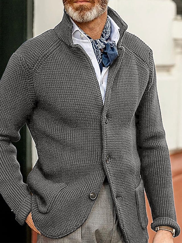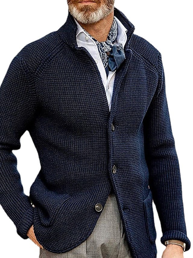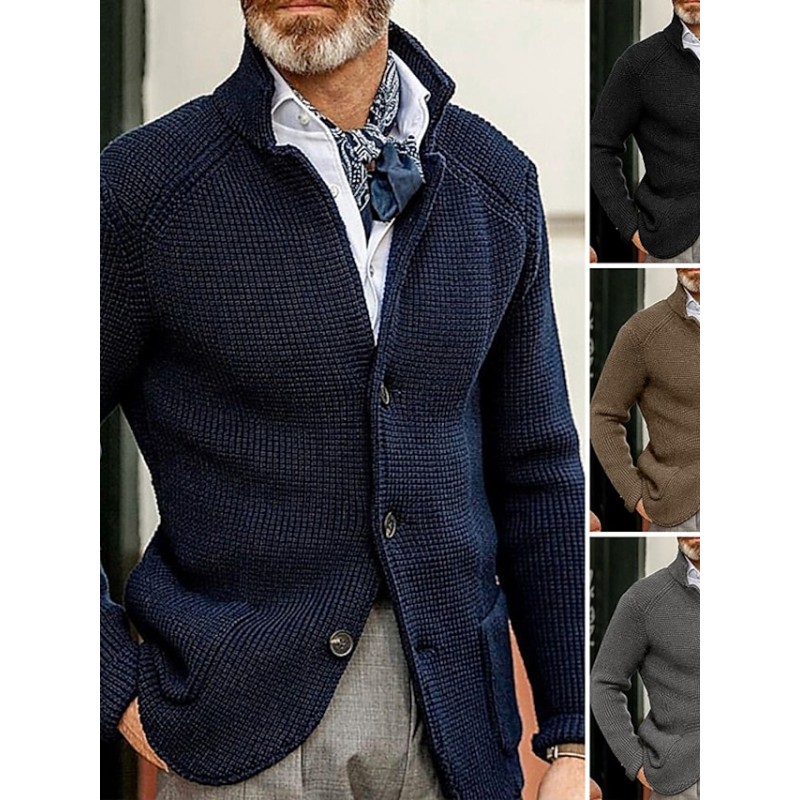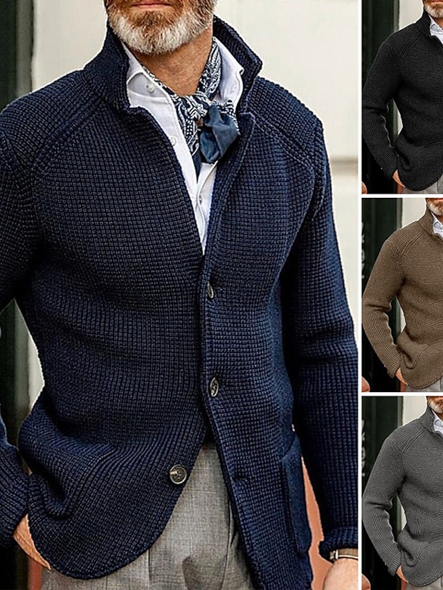 Men's Cardigan Sweater Jumper Waffle Knit Cropped Knitted Solid Color Stand Collar Stylish Basic Daily Holiday Fall Winter Black Blue S M L / Long Sleeve / Long Sleeve