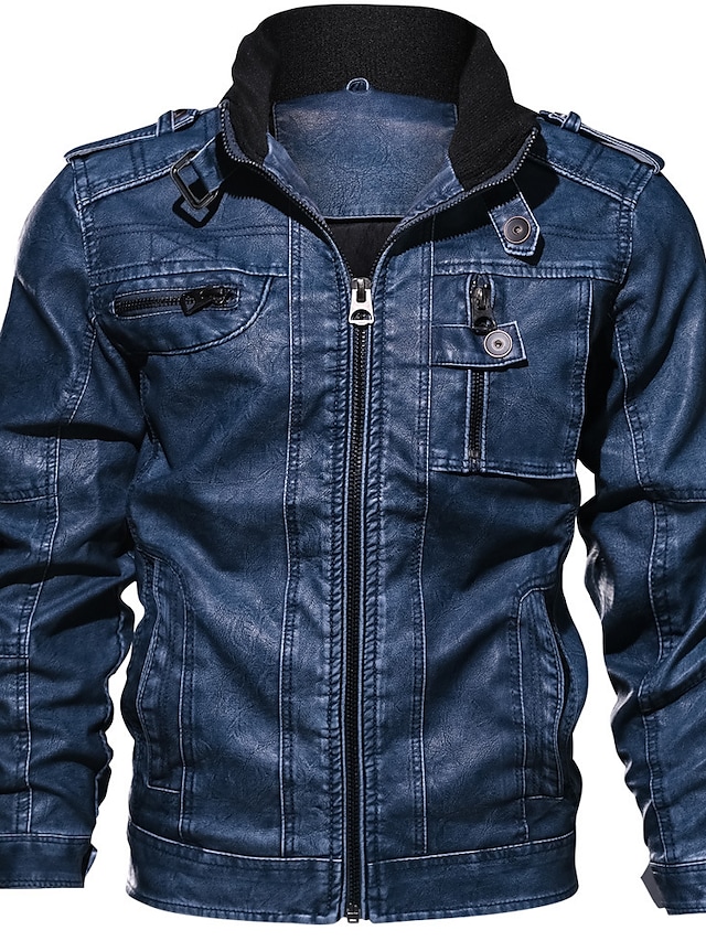 Men's Jacket Daily Fall & Winter Regular Coat Regular Fit Jacket Long Sleeve Solid Colored Black Khaki Light Blue / Faux Leather