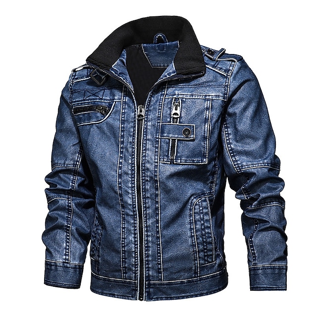Men's PU Leather Jacket Faux Leather Coat Motorcycle Biker Fashion Style Jacket Winter Casual Daily Outdoor Work Black Blue Khaki Warm Outwear Tops Waterproof Pocket