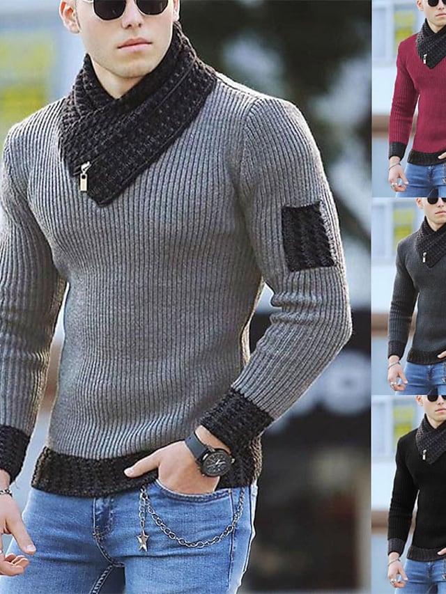 Men's Pullover Jumper Knit Knitted Color Block Turtleneck Ethnic Style Daily Fall Spring Black Gray S M L / Long Sleeve / Long Sleeve / Loose