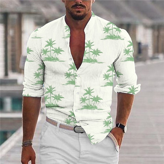 Men's Shirt Leaves Stand Collar Green Long Sleeve 3D Print Outdoor Casual Button-Down Print Tops Fashion Designer Casual Comfortable / Sports