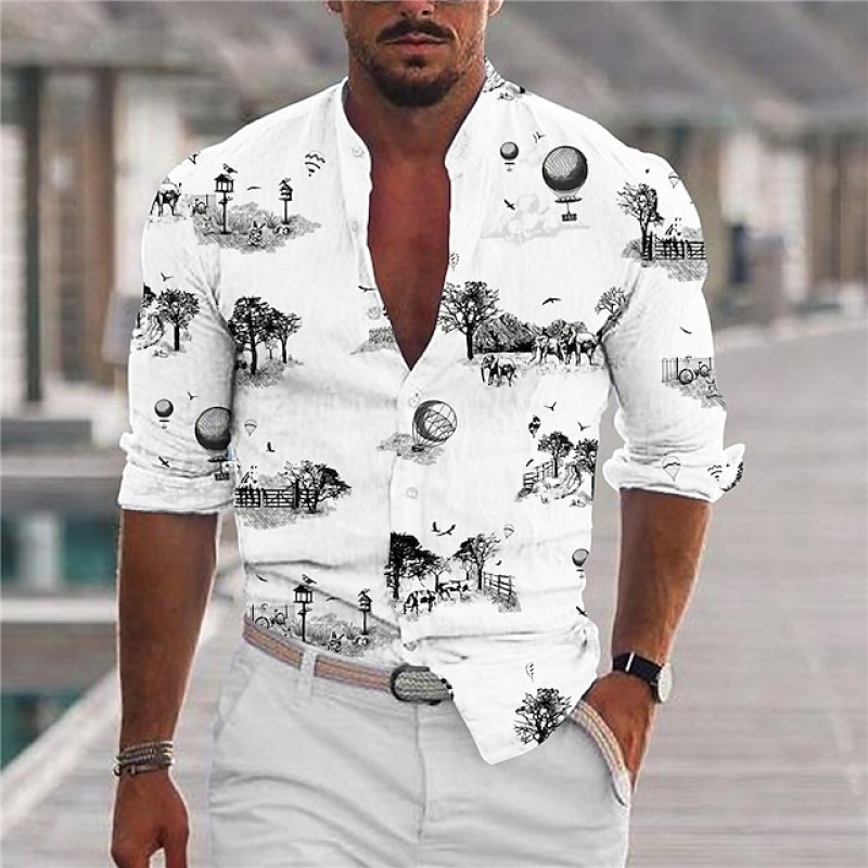 Men's Shirt Scenery Stand Collar White Long Sleeve 3D Print Outdoor Casual Button-Down Print Tops Fashion Designer Casual Comfortable / Sports