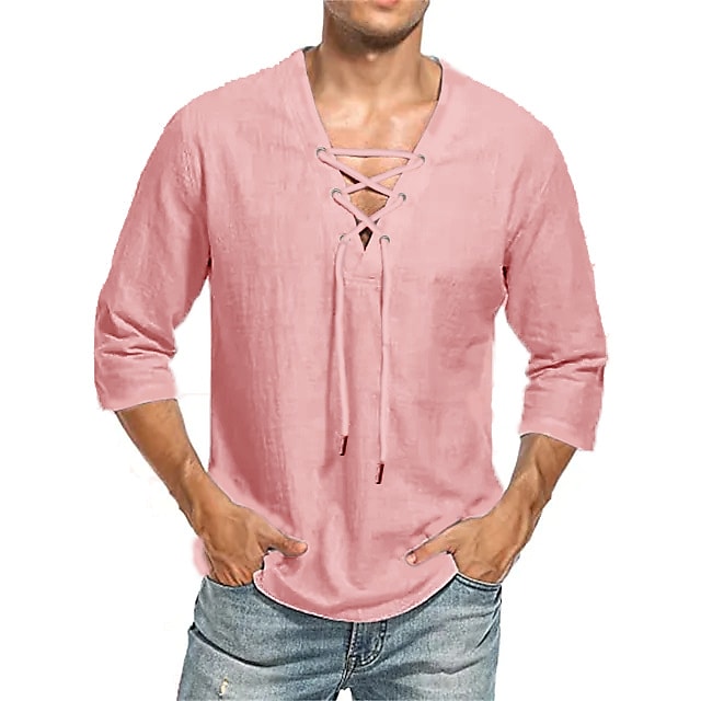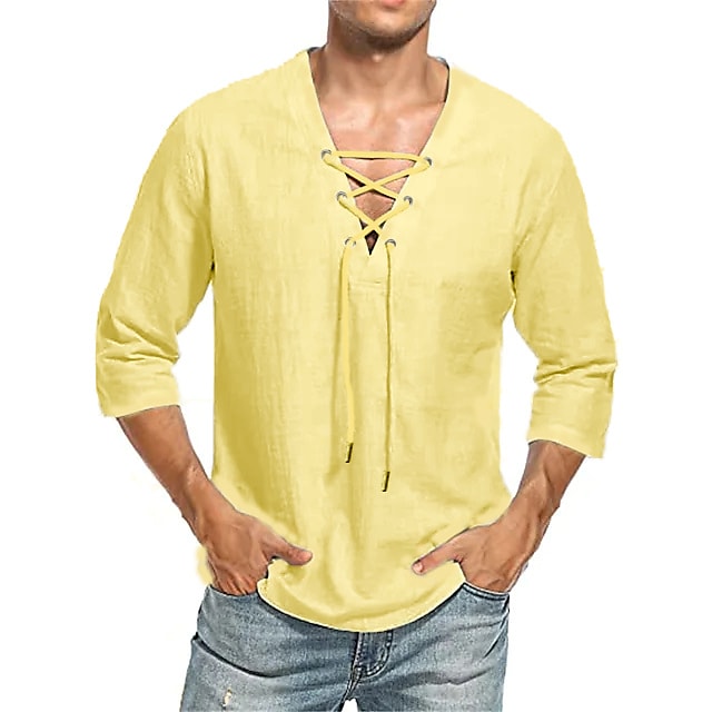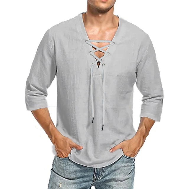 Men's Shirt Solid Color V Neck Drawstring Party Casual 3/4 Length Sleeve Tops Casual Daily Streetwear Beach Vacation Holiday Summer Fall Shirts Comfortable Lightweight White