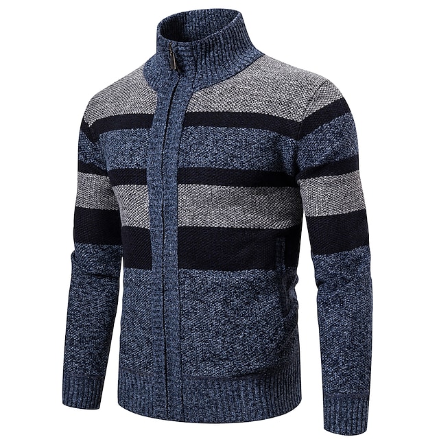 Men's Sweater Cardigan Jumper Knit Knitted Striped Stand Collar Stylish Casual Sport Daily Fall Winter Blue Camel M L XL / Long Sleeve / Long Sleeve