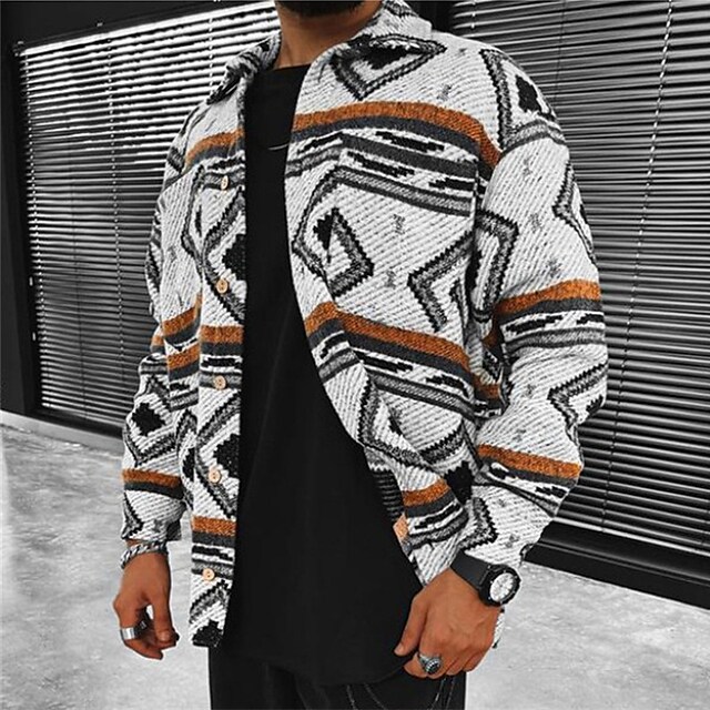 Men's Thick Shirt Shirt Jacket Argyle Turndown White Long Sleeve Print Daily Vacation Button-Down Tops Fashion Casual Comfortable / Winter / Fall / Winter